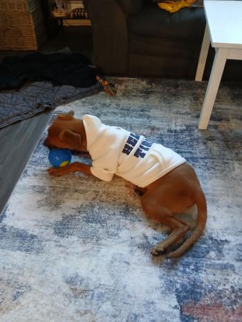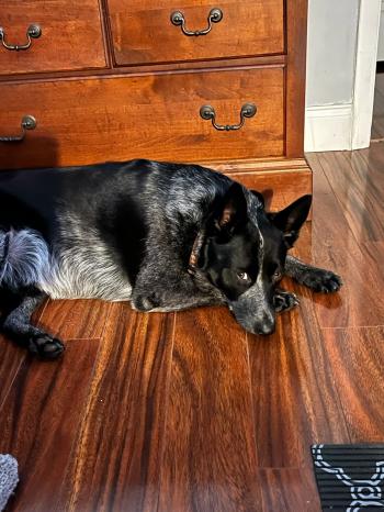 Jasper is settling in well. He slept last night next to my side on his little bed with his blanket. We walked around our neighborhood yesterday and he did fantastic. Walked him last night. This morning I walked him at 5 am before I had to get ready for work. He's doing great. Here he is being my co-worker this morning.