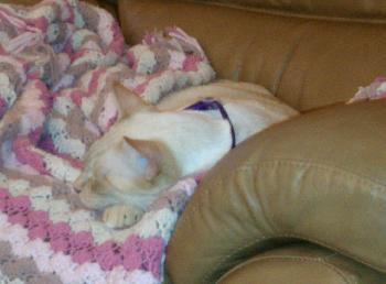 Just wanted to send a picture of Moche...my adopted son (lol) lounging on my afghan in my recliner. He likes to keep it warm for me! Thought you could add the pic to your album! Marcia