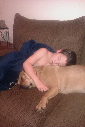 Nora is doing really good! I can't get over how sweet and good she is. Thank you for helping us find her! I attached a pic of her and my son, they fell asleep on the couch together :) Thank you! Angela