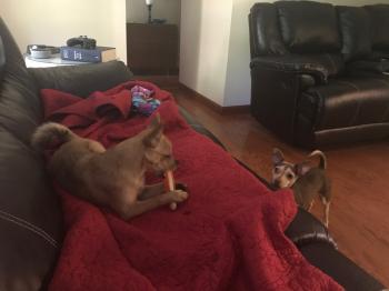 We are having a blast! The dogs are adjusting pretty well and are having a bunch of fun chasing each other in the yard (raini is much faster than radar). They have really enjoyed their time playing with the kids and so far have decided they will only sleep if they can be in bed with us.