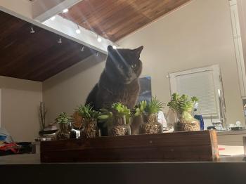 (orange tabby) & Grizzly (we’re sure he’s a Blue Russian…you named him Smokey) from you in February 2015. They are thriving members of our family.