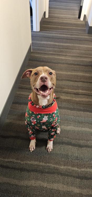 It dawned on me earlier I haven’t provided you all with any recent updates on our girl so I wanted to do so. 8 years after adoption, she continues to be the light of our life. What a positive ambassador for her breed. She emits sunshine everywhere she goes. She is a frequent visitor at my office and my coworkers are obsessed with her. Even at 8 years old, she is full of spunky energy. We purchased a house last year so she now has a fenced in backyard all her own! Attached is a recent photo of a visit to my office.