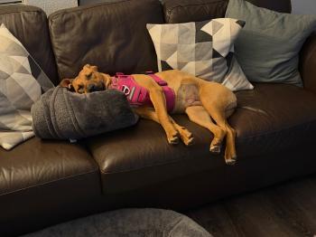 Cami ( Layla ) has settled in nicely in her new home. She loves her neighborhood dog park and all the new friends she’s met and played with over the past few weeks. She’s claimed her favorite blankets and spot on the couch after a long day of puppy play!