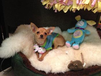We are doing great. We are calling him Bruno T Bone. Shanley liked Bruno and Shane liked T Bone so we put them together. He is doing great. He just loves Shanley. He slept with her until we went to bed and then slept with us. He has an appointment tomorrow at 10am. I will let you know how it goes. It's really hard to get a picture of him. He is usually always moving. I will get one of him and Shanley so you can post it on the website. He is so great and I love the way he gets along with the girls. The first day he barked at teagan and she just laughed at him. Today he started getting closer to her and gave her kisses when he could. One of his favorite toys so far is a mouse that sounds like a mouse. It was lucy's favorite toy for a while. Thank you so much!!!