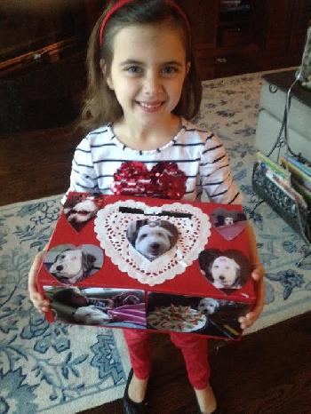 Hello! Thought you all would enjoy these. Pippa is doing great! Such a sweet girl with a great sense of humor. Physically she’s doing well. She loves a good run around the block 3-4 days a week and has suckered us all into the belief that the back yard is not an adequate space for the bathroom which results in several walks a day:). Although we finally gave up on “heel” she has been surprisingly easy to train in all other aspects. Everyone was extremely impressed that there was a low lying unsupervised table full of food at Thanksgiving and although she was eyeing it she didn’t touch a morsel. When she first arrived anything was game so this is a huge improvement. She’s a great girl. Extremely loyal to our family and a joy to everyone that visits-we are blessed! Hope all is well! Jen PS-the kids could pick any theme for their valentine boxes this year…….