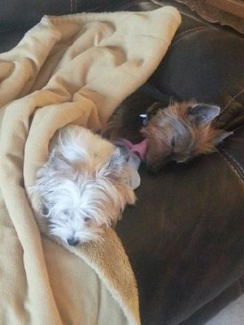 First evening as we watched TV our boys were tuckered out and laid together.​ They are fitting in quite well and have made friend with the 120 lb Lab Shawby that lives behind us and we share a fence with. Giovanni has come out of his shell and is becoming the master of the home :) Gerry and Ronda